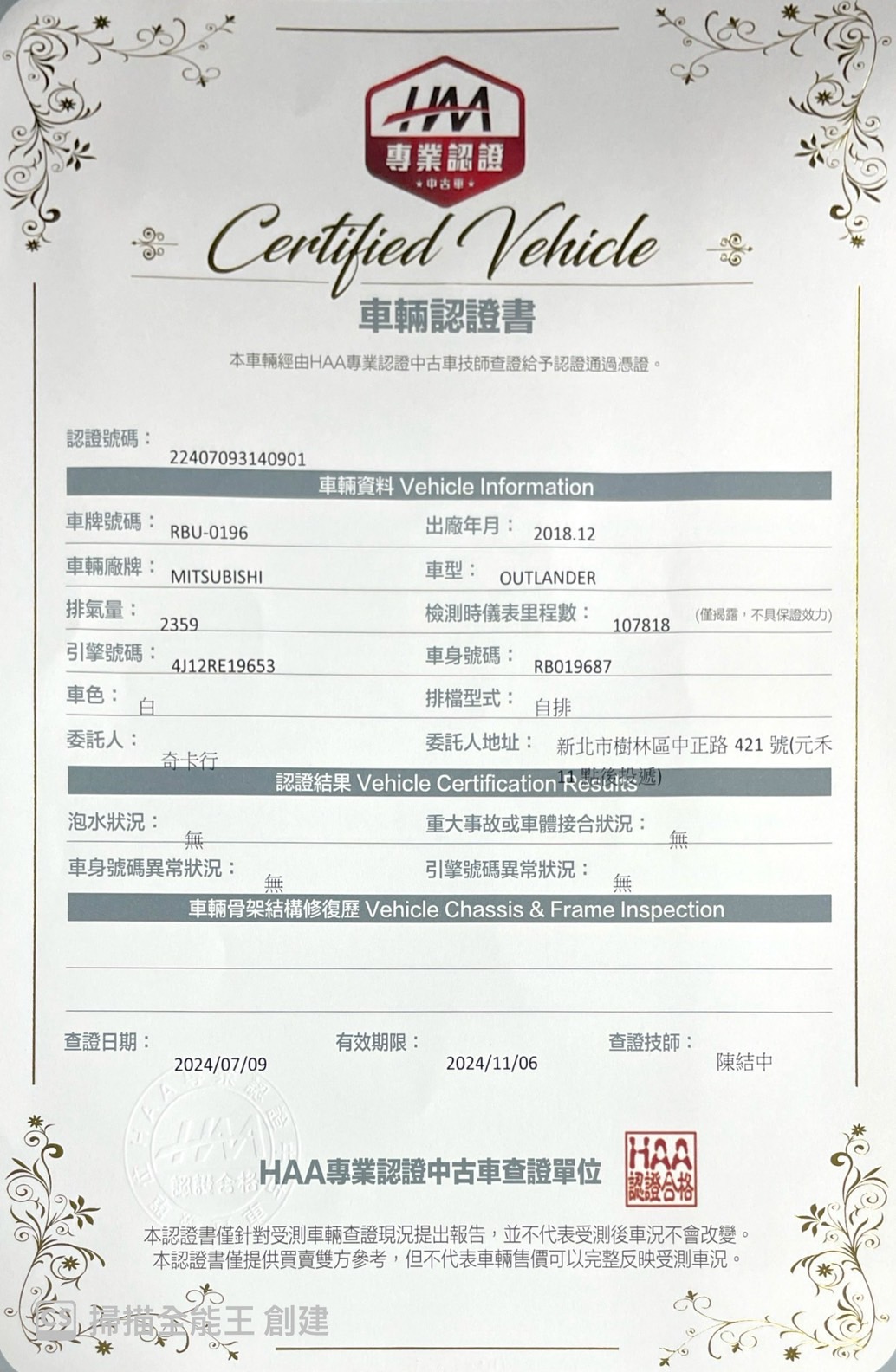 Mitsubishi (82) 2018/12月出廠 Outlander 典藏型 2.4